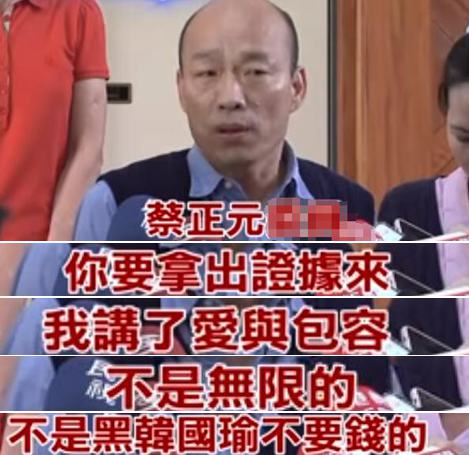 韓國(guó)瑜怒嗆蔡正元,要他“拿出證據(jù)來(lái)”;還表示,如果自己真的有拿這么多錢,那就——辭掉高雄市長(zhǎng)職務(wù)!