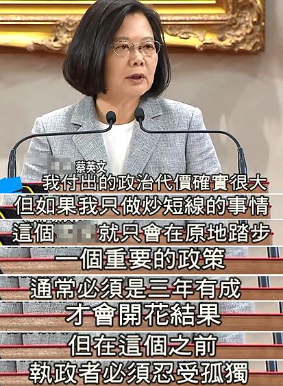 蔡英文聲稱一個重要的政策,通常必須“3年有成”才會開花結(jié)果,“但在這之前,執(zhí)政者必須忍受孤獨(dú)”;她接著“訴苦”道,很多朋友認(rèn)為她很傻,做愈多,被罵愈兇,但她要告訴三年來感到失望的朋友,多一點(diǎn)耐心,就會看見當(dāng)局“做的事比想象多很多”。同時,她還不忘對三年來不斷唱衰臺灣的人喊話,“你們不會得逞”……