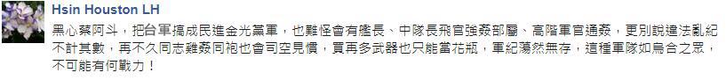 日前,有人在臉譜網(wǎng)上披露,蔡英文4月間到嘉義開講防務施政,與鄉(xiāng)親說明政績時稱,當臺灣地區(qū)領導人以來,用最多時間、最用力的事,除了外事工作就是防務工作;之后更公然宣稱,因為國民黨執(zhí)政太久,所以臺軍“過去都和國民黨在一起”、“和民進黨不親”,是她在執(zhí)政后,用了二、三年和軍方溝通、合作,終于,現(xiàn)在他們(軍隊)已經(jīng)和“我們”一樣同心了。