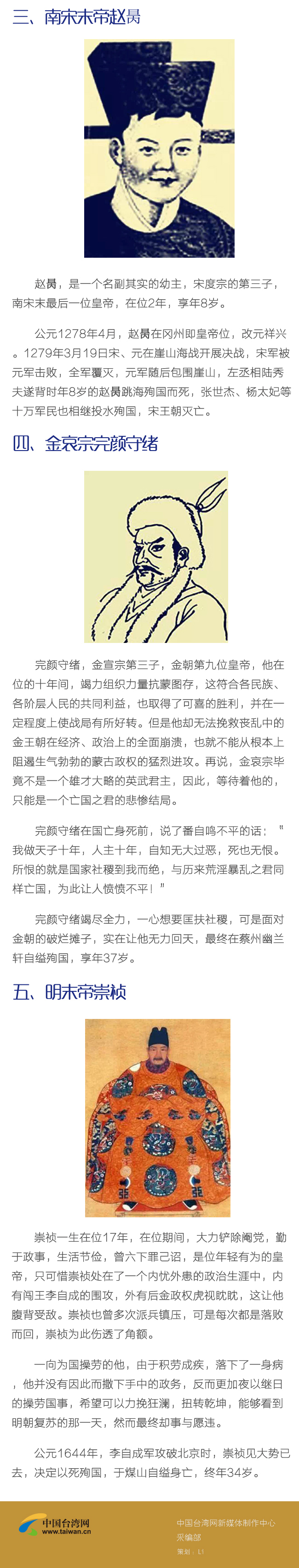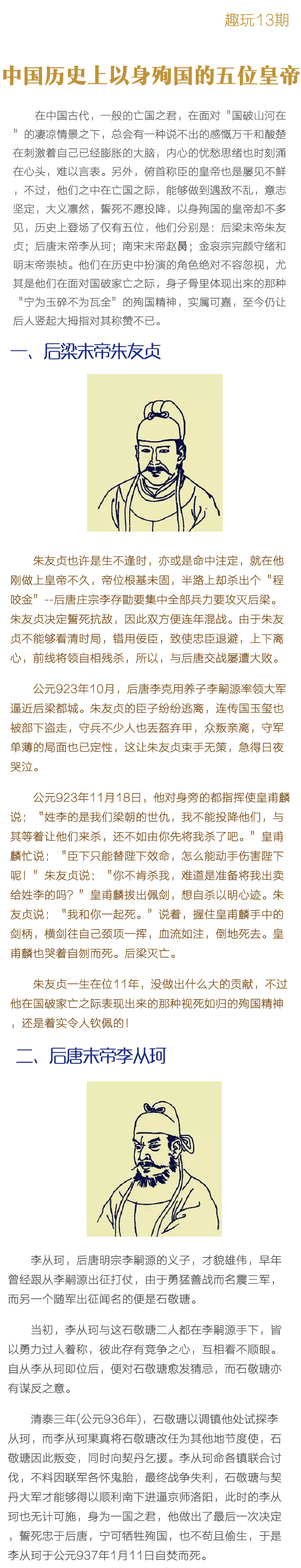 在中國古代,一般的亡國之君,在面對“國破山河在”的凄涼情景之下,總會有一種說不出的感慨萬千和酸楚在刺激著自己已經(jīng)膨脹的大腦,內(nèi)心的憂愁思緒也時刻涌在心頭,難以言表。另外,俯首稱臣的皇帝也是屢見不鮮,不過,他們之中在亡國之際,能夠做到遇敵不亂,意志堅定,大義凜然,誓死不愿投降,以身殉國的皇帝卻不多見,歷史上登場了僅有五位,他們分別是:后梁末帝朱友貞;后唐末帝李從珂;南宋末帝趙昺;金哀宗完顏守緒和明末帝崇禎。他們在歷史中扮演的角色絕對不容忽視,尤其是他們在面對國破家亡之際,身子骨里體現(xiàn)出來的那種“寧為玉碎不為瓦全”的殉國精神,實屬可嘉,至今仍讓后人豎起大拇指對其稱贊不已。