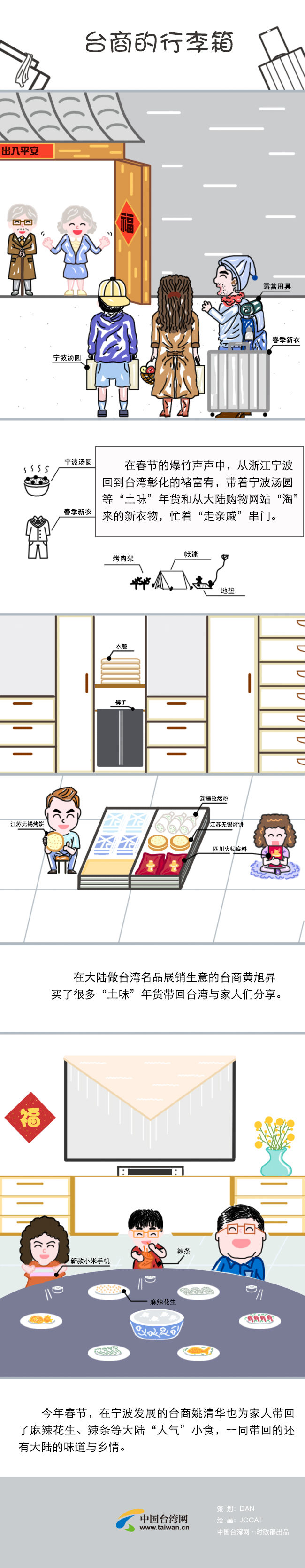 春節(jié)期間,在陸臺(tái)商紛紛跨越淺淺的一灣海峽,返回臺(tái)灣過(guò)年。而在他們的“年貨禮包”中,既有“舌尖上”的大陸傳統(tǒng)美食,也有與時(shí)俱進(jìn)的“觸網(wǎng)”新配方。這些琳瑯多元的年貨,折射出兩岸交流的日益緊密,以及“兩岸一家親”的情感融合。