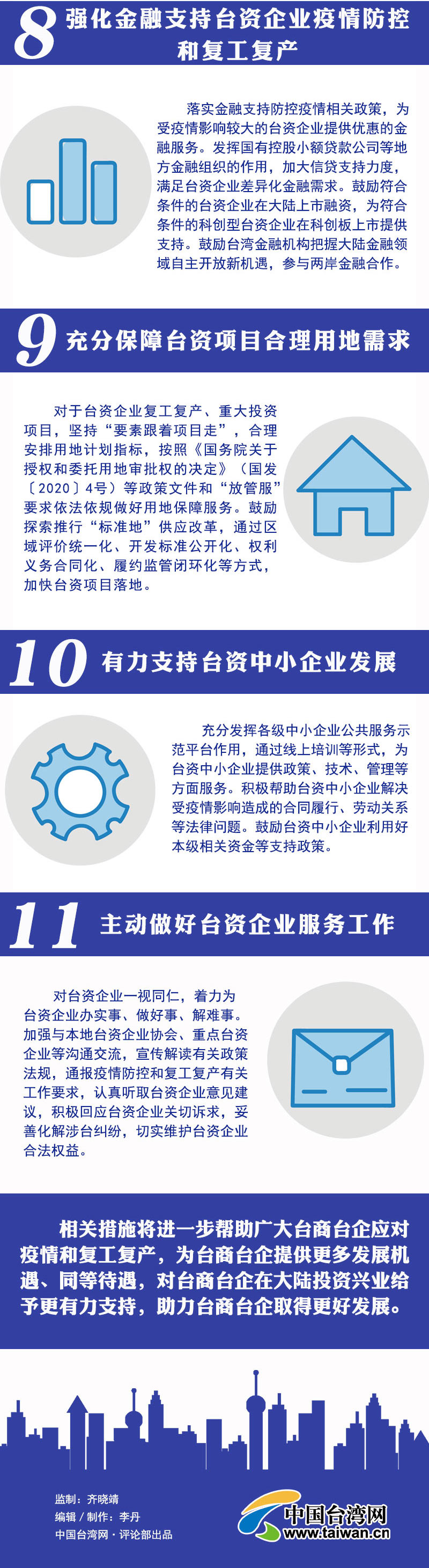 15日,國(guó)家發(fā)展改革委、國(guó)務(wù)院臺(tái)辦、工業(yè)和信息化部等十部門(mén)聯(lián)合印發(fā)了助力臺(tái)企“11條措施”。相關(guān)措施將進(jìn)一步幫助廣大臺(tái)商臺(tái)企應(yīng)對(duì)疫情和復(fù)工復(fù)產(chǎn),為臺(tái)商臺(tái)企提供更多發(fā)展機(jī)遇、同等待遇,對(duì)臺(tái)商臺(tái)企在大陸投資興業(yè)給予更有力支持。
