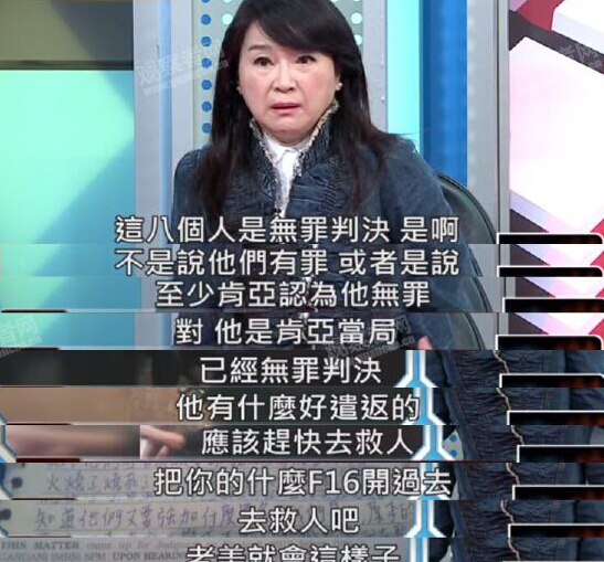 周玉蔻節(jié)目中指出,最不可思議的是這8人無罪,有什么好“遣返”的,臺灣應(yīng)該要趕快救人,“把你的什么F16開過去救人吧,老美就會這樣子啊!