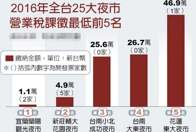 2016年全臺(tái)25大夜市營(yíng)業(yè)稅課征最低前5名。(圖片來(lái)源:臺(tái)灣《中國(guó)時(shí)報(bào)》)