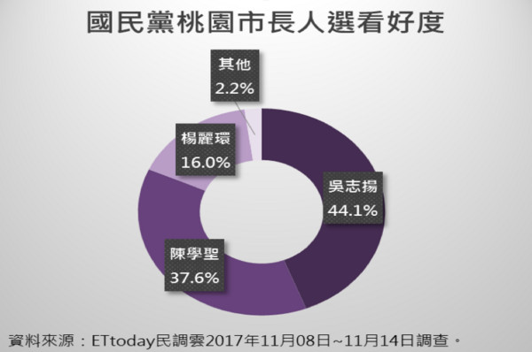桃園市長方面,吳志揚(yáng)曾任桃園縣長,2014年代表國民黨參選桃園市長時(shí),敗給民進(jìn)黨陣營的鄭文燦。據(jù)臺(tái)灣“中時(shí)電子報(bào)”報(bào)道,桃園市議會(huì)9月份進(jìn)行2018桃園市長問卷調(diào)查,了解選前1年民眾對(duì)于桃園市長人選的意見,共發(fā)出1萬份抽樣。7位可能參與桃園市長人選,暫以吳志揚(yáng)、陳學(xué)圣、魯明哲領(lǐng)先,吳志揚(yáng)為現(xiàn)任“立委”也是前任縣長。選民認(rèn)為吳與鄭文燦競選的機(jī)率較高。