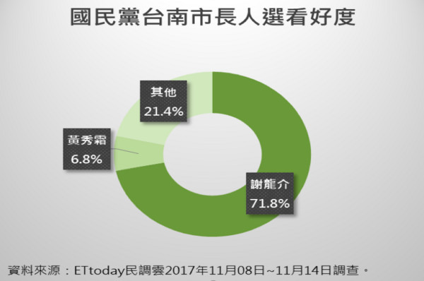 臺(tái)南市候選人中,現(xiàn)任市議員謝龍介(71.8%)受網(wǎng)友看好,上屆參選落敗的黃秀霜看好度僅6.8%。交叉分析顯示,謝龍介不論在哪個(gè)族群的看好度都大幅領(lǐng)先黃秀霜。