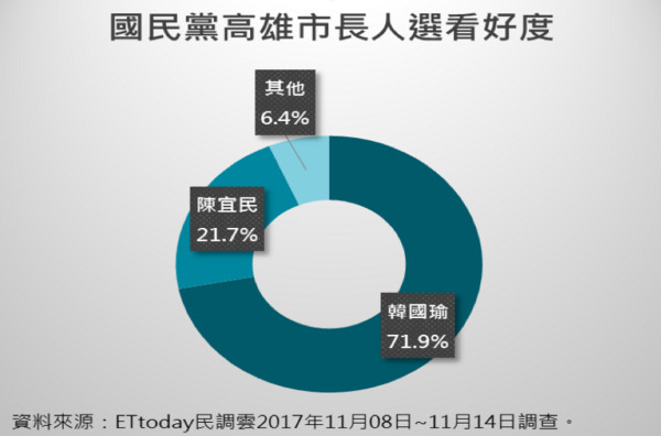 高雄市以現(xiàn)任國民黨高雄市黨部主委韓國瑜(71.9%)民調(diào)最高,網(wǎng)友最看好其出面挑戰(zhàn)高雄市長寶座,而現(xiàn)任不分區(qū)“立委”陳宜民的看好度為21.7%,且不論在男性或女性均獲7成2左右的看好度,大幅勝過陳宜民。年齡方面,韓國瑜不論在哪個(gè)族群的看好度都大幅領(lǐng)先陳宜民。