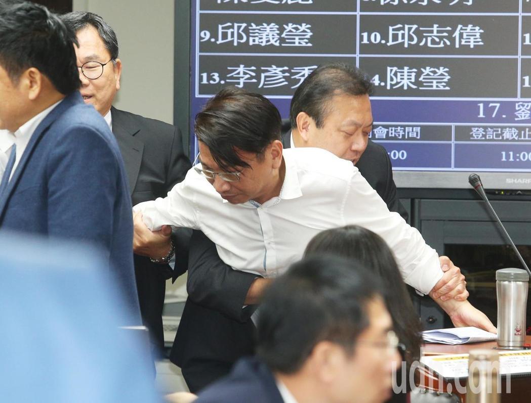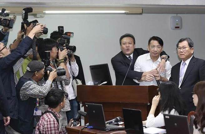 “時代力量立委”徐永明(右二)強(qiáng)占發(fā)言臺近11個小時后,在民進(jìn)黨“立委”強(qiáng)力拉扯出“委員會”后,會議才可開始。(圖片來源:臺灣《聯(lián)合報》)