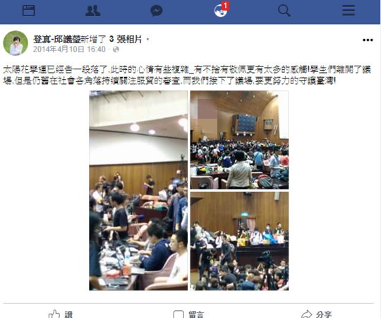 此事一經(jīng)報道傳出,有網(wǎng)友翻出2014年“學(xué)運(yùn)”落幕時,邱議瑩在臉譜網(wǎng)(Facebook)寫下感性的字句:“‘太陽花學(xué)運(yùn)’已經(jīng)告一段落了,此時的心情有些復(fù)雜,有不舍有敬佩更有太多的感觸!學(xué)生們離開了議場,但是仍然在社會各角落持續(xù)關(guān)注‘服貿(mào)’的審查,而我們接下了議場,更要努力守護(hù)臺灣!”