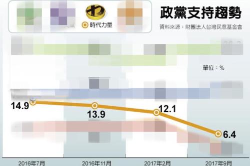 據(jù)《聯(lián)合報》今年9月份報道,親綠的臺灣民意基金會針對政黨進(jìn)行支持度的調(diào)查,“時力”的支持度僅剩6.4%;饡麻L游盈隆稱,“時力”流失原有支持度的57%,“這對一個新興的小黨可以說是一個非常嚴(yán)重的警訊,有邊緣化和泡沫化危機(jī)!