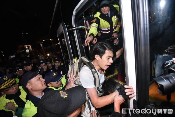 抗議勞團民眾4日晚間被警方驅(qū)散后,改往蔡英文辦公室附近散步,但仍遭警方包圍,強制帶上警車。(圖片來源:臺灣“東森新聞云”)