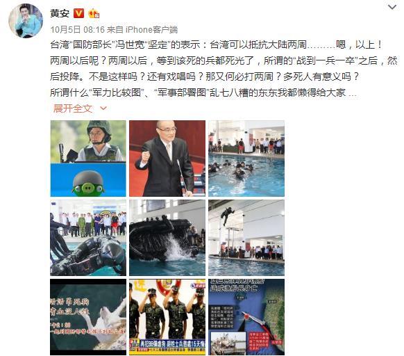 對(duì)此,向來關(guān)注兩岸動(dòng)態(tài)的黃安在微博上發(fā)表看法,他寫道,兩周以后,等到該死的兵都死光了,所謂的“戰(zhàn)到一兵一卒”之后,然后投降。不是這樣嗎?還有戲唱嗎?那又何必打兩周?多死人有意義嗎?