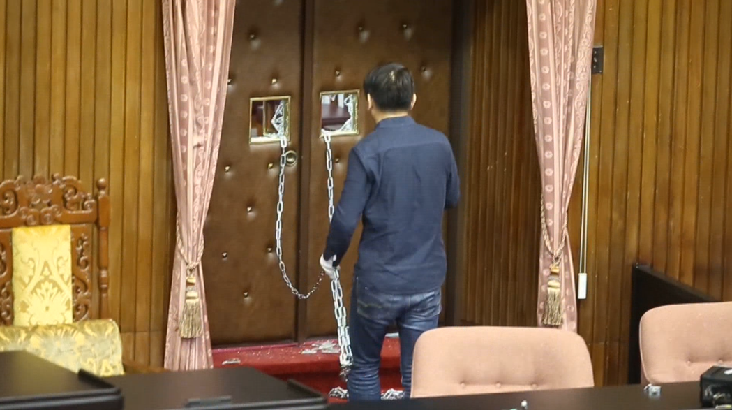 議場(chǎng)內(nèi)大門玻璃被敲碎,并用鎖鏈鎖住。(圖片來源:臺(tái)灣《中時(shí)電子報(bào)》)