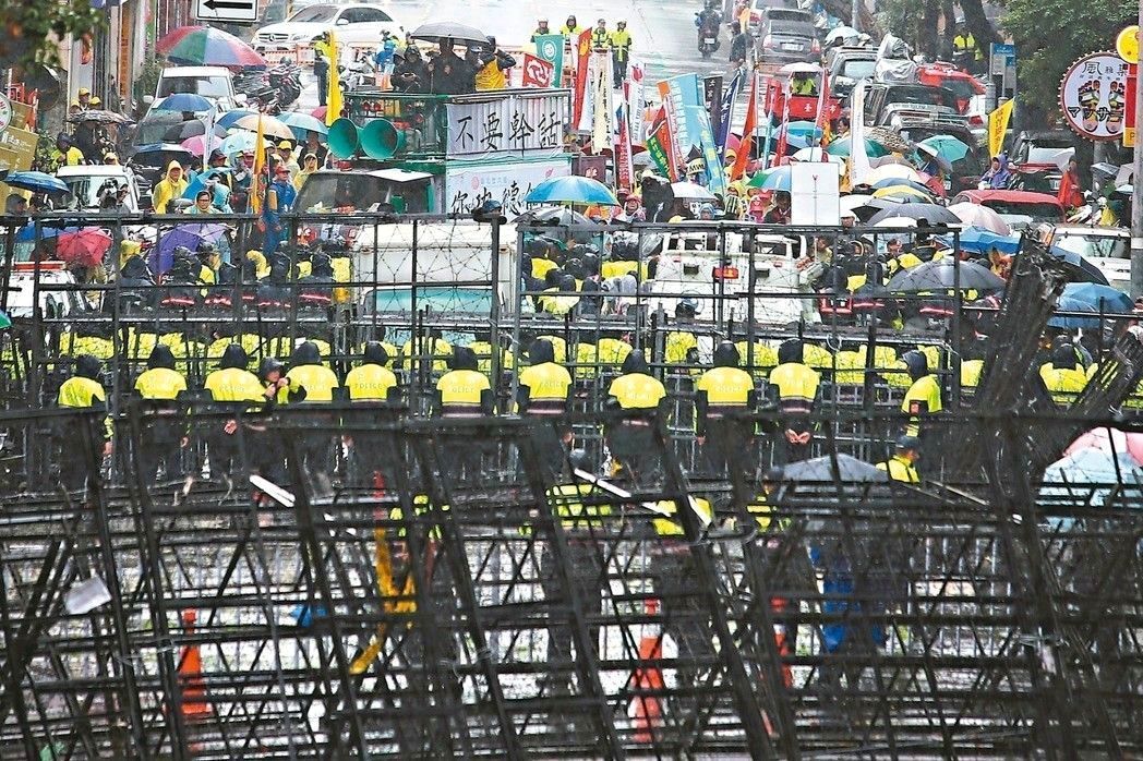 勞工與學(xué)生團(tuán)體23日舉行反“勞基法”修惡大游行,在“行政院”前靜坐的游行群眾,晚間再度與警方爆發(fā)肢體沖突。(圖片來源:臺灣《中時電子報》)