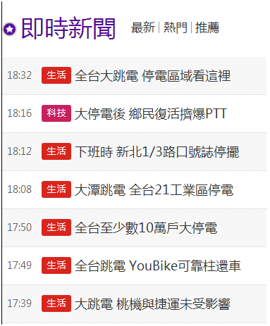 臺(tái)灣《中時(shí)電子報(bào)》關(guān)于“全臺(tái)大停電”的報(bào)道截圖(部分)。