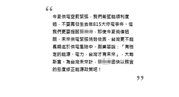 蔡當(dāng)局承認(rèn),今年夏天供電“情勢(shì)非常嚴(yán)峻”,不惜唾面自干讓原本停機(jī)的核電機(jī)組重啟加入并聯(lián)。蔡當(dāng)局也保證說只要今年過關(guān),未來的供電就會(huì)充裕而穩(wěn)定。但非常遺憾的是,按現(xiàn)行供電與電力需求趨勢(shì),未來供電情勢(shì)只會(huì)更加嚴(yán)峻,而非“輕舟已過萬重山”。