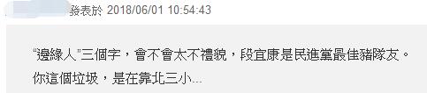 段宜康的這番“邊緣人”言論還沒等到呂秀蓮親自回應,網友們就看不下去了:“曾經與這種人同黨還真倒霉”“有本事不要待在不分區(qū)”“人家邊緣至少還能當副‘總統’,不像你自己其實邊緣到個極致,只能發(fā)個廢文”“你的曲棍球呢?”“支持段宜康=支持姚文智=支持民進黨”“做人總比做畜牲好”“要不要吞曲棍球。”