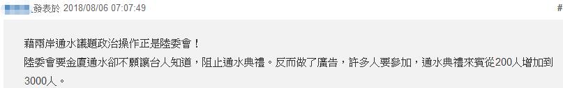 這就不得不提臺當(dāng)局先前的政治操作。據(jù)《中時電子報》7月31日報道,通水典禮早定于8月5日舉行,臺灣陸委會7月27日卻突然“建議”延后,理由是“時機(jī)不宜”。直接背景是日前東亞青年運動會在臺中市的舉辦權(quán)被取消,臺當(dāng)局歸咎于大陸“打壓”,欲借機(jī)“反制”。民進(jìn)黨隨后遭輿論痛批枉顧民生。金門縣政府認(rèn)為,兩岸通水是金門民眾的首要民生大事,不應(yīng)泛政治化,堅持如期舉辦通水儀式。