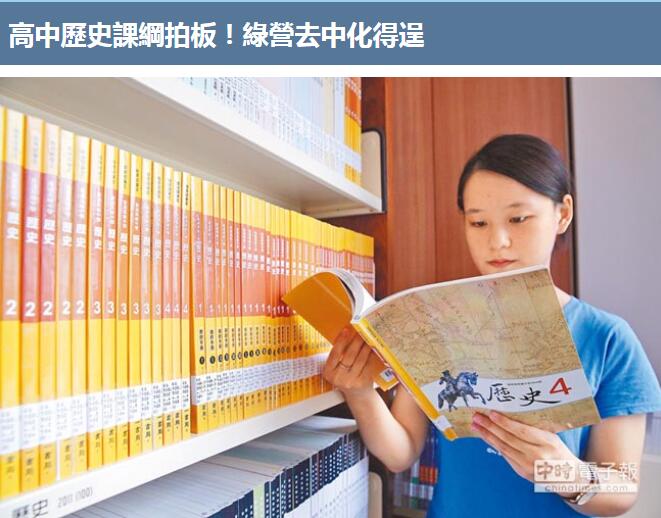 臺灣現(xiàn)行的高中歷史課綱分成臺灣史、中國史及世界史等3部分,明年上路的12年義務(wù)教育課綱(即新課綱)則改為臺灣史、東亞史及世界史,將“中國史納入東亞史的架構(gòu)下討論”,中國史不再單獨(dú)存在。