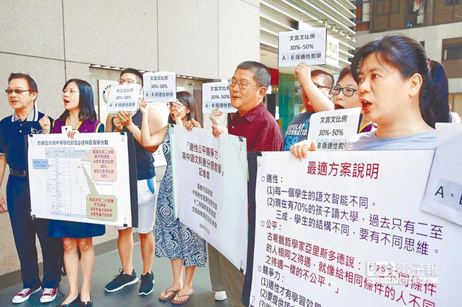 2017年臺“教育部”召開語文課綱審議會,有團(tuán)體在場外抗議,高呼“文言文比率30到50%!”(圖片來源:臺灣《中時(shí)電子報(bào)》)