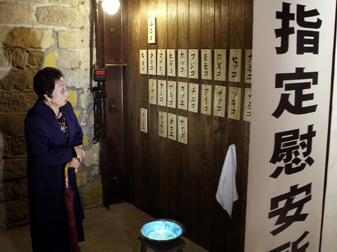 陳蓮花阿嬤二次大戰(zhàn)期間遭拐騙成慰安婦,曾參觀“慰安婦展覽”,望著墻上掛著慰安婦名牌的模擬慰安所。(圖片來源:臺灣《聯(lián)合報(bào)》)