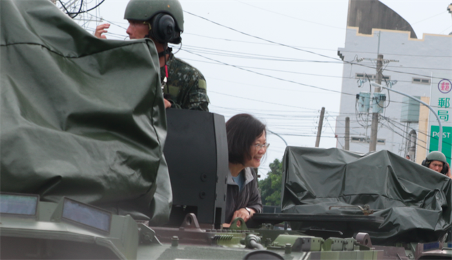 蔡英文搭云豹裝甲車(chē)進(jìn)入尚在淹水的布袋鎮(zhèn)永安里勘災(zāi)。(圖片來(lái)源:臺(tái)灣“中時(shí)電子報(bào)”)