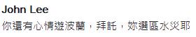 邱議瑩Facebook粉絲頁(yè)也被網(wǎng)友灌爆留言,“可以出來(lái)用罵薛香川的力道來(lái)檢視一下陳建仁嗎?”“怎沒(méi)見(jiàn)你氣到踹門(mén)、砸電視還是快中風(fēng)?”“還有心情去金門(mén)旅游,拜托,水災(zāi)欸”“拜托,人家臺(tái)灣價(jià)值欸”“那些災(zāi)民只是錄像帶啦(邱曾指場(chǎng)外勞工抗議是放錄像帶)”,不少網(wǎng)友狂用“拜托水災(zāi)欸”五字洗版。