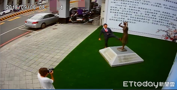 藤井實彥用腳踹慰安婦銅像的粗暴行為被監(jiān)視器全都錄下。(圖片來源:臺灣“東森新聞云”)