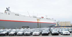 拜經(jīng)濟景氣復(fù)蘇所賜,臺中港進口車數(shù)量屢創(chuàng)新高!利比里亞籍“地球精靈號”,20日載來849輛價值新臺幣26億元奔馳、BMW及保時捷高級進口車搶灘。臺中港務(wù)局預(yù)估今年進口名車約達8千輛,5月份累計達1千7百多輛,創(chuàng)開港34年來單月新高。圖片來源:臺灣《中國時報》