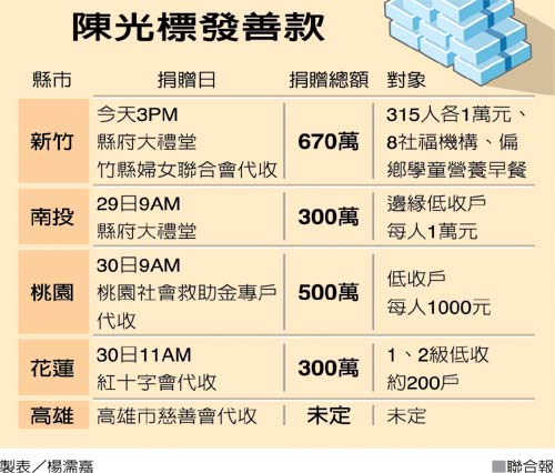 大陸慈善企業(yè)家陳光標(biāo)發(fā)善款,將于今天下午抵達第一站新竹縣,善款總金額達670萬(新臺幣,下同),已敲定由新竹縣婦女聯(lián)合會代收,轉(zhuǎn)贈高風(fēng)險家庭、社福機構(gòu)與贊助偏鄉(xiāng)學(xué)童早餐。新竹縣邀請受贈對象共計315人,以高風(fēng)險家庭、救助邊緣戶、孤苦無依老人為主。
