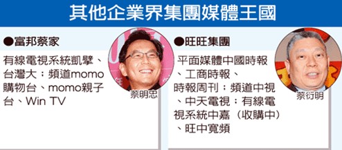 攤開兩大集團(tuán)媒體布局,富邦蔡明忠與臺(tái)灣大蔡明興擁有全臺(tái)最大有線電視系統(tǒng)臺(tái)凱擘、有線電視頻道、電信固網(wǎng)等;蔡衍明則獨(dú)缺系統(tǒng)臺(tái),平面媒體與有線、無線電視頻道一應(yīng)俱全。