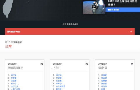 臺(tái)灣部分,李宗瑞雄據(jù)搜尋關(guān)鍵詞與人物搜尋榜雙料冠軍,同時(shí)進(jìn)榜的還有鳳飛飛,Makiyo與林益世等;而林書豪則為體育相關(guān)搜尋榜冠軍,代表臺(tái)灣登上奧運(yùn)殿堂的跆拳道選手曾櫟騁與楊淑君,乒乓球選手莊智淵也榜上有名。(中國臺(tái)灣網(wǎng) 李帥)