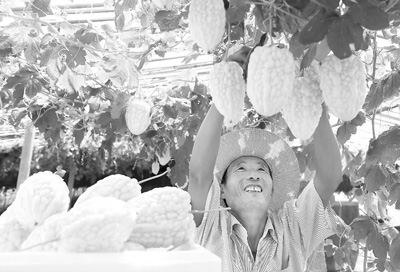 在臺灣農業(yè)專家指導下,2016年山東省臨沂市沂南縣寶島果蔬合作社從臺灣引種的“蘋果苦瓜”喜獲豐收,平均畝產1.2萬斤,每斤售價10元左右。這個新品種苦瓜形如蘋果,晶瑩亮白,苦中帶甜,產品遠銷北京、上海,經(jīng)濟效益非常突出。今冬明春,合作社將擴種到200多畝,帶動更多農戶致富。