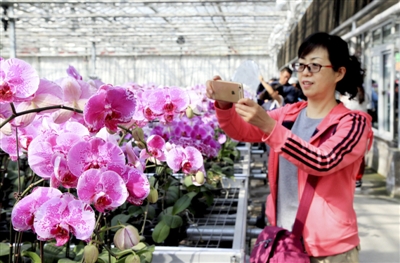 由臺商投資控股的上海雍大實(shí)業(yè)有限公司與新疆生產(chǎn)建設(shè)兵團(tuán)第六師五家渠市簽訂了8億元投資協(xié)議,在五家渠市建設(shè)一個(gè)年產(chǎn)3000萬株蘭花的種植基地。目前,基地內(nèi)已建成2萬余平方米的展區(qū),種植了130余種各色蝴蝶蘭,主要銷往我國西北地區(qū)及絲綢之路沿線各地。圖為近日游客在五家渠市雍大蘭花莊園游覽并拍照留念。 魏新江攝(人民圖片)