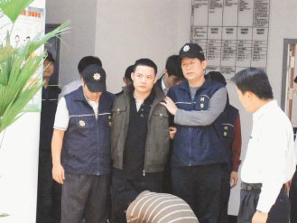 吳東威(中)等人涉嫌放高利貸,為追討14萬(wàn)元債務(wù)逼死陳綾蕙,昨天被警方逮捕。圖片來(lái)源:臺(tái)灣《聯(lián)合報(bào)》