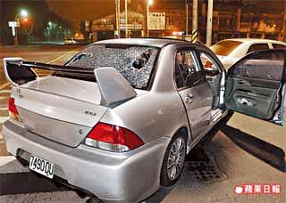 鄭姓駕駛的改裝轎車被砸得一塌糊涂。 來源:臺(tái)灣《蘋果日?qǐng)?bào)》