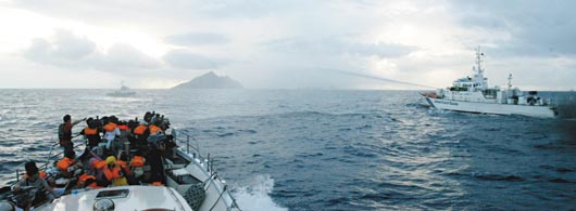 臺(tái)灣“保釣行動(dòng)聯(lián)盟”16日到釣魚(yú)島,遭受日本艦艇噴水柱干擾。(圖:臺(tái)灣《聯(lián)合報(bào)》) |