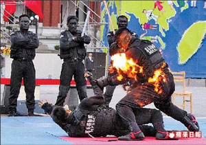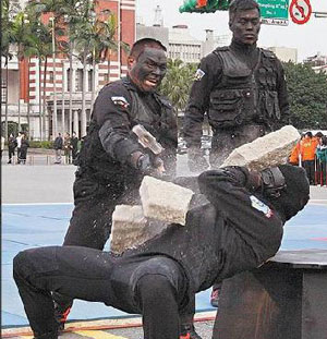以往神秘的憲兵特勤隊(duì),近年為爭(zhēng)取預(yù)算頻頻曝光,還要表演碎大石等“雜技” 。來源:臺(tái)灣《蘋果日?qǐng)?bào)》