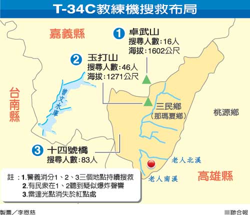 根據(jù)岡山空軍官校塔臺雷達(dá)光點位置,臺空軍分析教練機(jī)可能在高雄縣那瑪夏鄉(xiāng)山區(qū)出事,臺軍陸軍第八軍團(tuán)和高雄縣政府消防局火速出動救難人員上山。昨日下午4時,由臺軍警及義消組成的搜救隊在高雄縣三民消防分隊集結(jié)。
