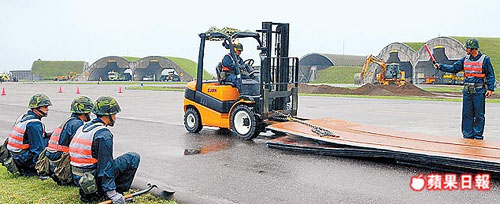 臺軍演練飛機(jī)跑道被毀時(shí),以鋪設(shè)玻璃纖維板來搶救。來源:臺灣《蘋果日報(bào)》