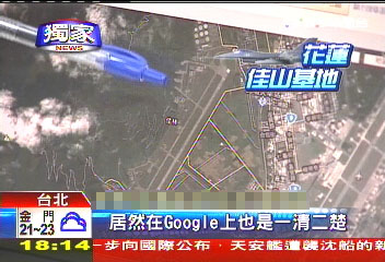 臺灣TVBS記者稱:“我所在的位置是北安路上的海軍總部,不過從Google maps的鳥瞰圖看起來,卻是模糊一片。”在Google地圖里涉及“國安機密”的地方,全都被打上馬賽克。例如陽明山上的“國安局”、仁愛路旁的空軍總部,都不再全都露。甚至屬于后援性質,主管軍需品生產的聯(lián)勤總部,在Google地圖里也全被打上馬賽克。