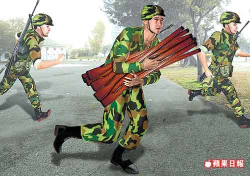 臺(tái)軍中尉排長(zhǎng)以不服指揮為由惡整蘇姓男兵,要他全副武裝,抱11把木槍出操。圖片來源:臺(tái)灣《蘋果日?qǐng)?bào)》
