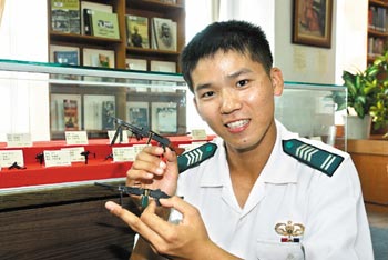 中國(guó)臺(tái)灣網(wǎng)6月16日消息 據(jù)臺(tái)灣《聯(lián)合晚報(bào)》報(bào)道,臺(tái)軍陸軍官校管理科學(xué)系四年級(jí)學(xué)生郭晉愷無(wú)師自通,用紙張為原料,做出縮小比例,唯妙唯肖的槍支模型。在他的迷你軍火庫(kù)中有50多種槍支,都是靠著一把刀、一張紙、瞬間接著劑做出來(lái)的,比起日本模型公司出品的槍支模型毫不遜色,陸軍官校還為他舉行個(gè)展。