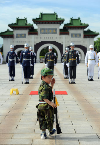 以雨傘模擬“儀仗隊(duì)”操槍在島內(nèi)網(wǎng)絡(luò)暴紅的3歲男童 Ryan(前)15日如愿以償,獲臺軍方頒贈205兵工廠制造的仿真迷你木槍,并在臺北忠烈祠與“三軍儀仗隊(duì)”一同操槍。 圖片來源:臺灣“中央社”
