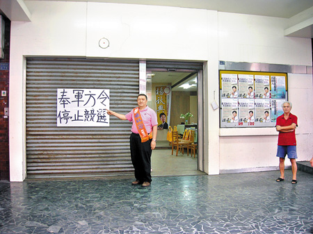 楊統(tǒng)一、王懋昌等人獲悉后,昨日下午拉下鐵門停止選舉活動,并雇人拆除楊秋興選舉廣告牌,但楊統(tǒng)一等強烈質(zhì)疑臺軍方故意打壓參選人。楊統(tǒng)一等人并寫上“奉軍方令停止競選”、“奉軍方停止使用”兩張大海報,分別貼在電卷鐵門上,以示不滿抗議。