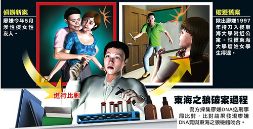 今年5月一名女子向臺中市婦幼隊(duì)報案,指遭友人性侵,警方逮捕在臺當(dāng)局海事部門臺中海巡局服務(wù)的二等士官長廖泰余(37歲),采集檢體送刑事局比對,竟與1997年東海詹姓女學(xué)生陰道采集到的東海之狼檢體吻合,前晚9時許警方會同臺軍方至臺當(dāng)局海事部門逮捕廖嫌。檢警連夜偵訊,廖嫌坦承在1997、1998共犯4起性侵強(qiáng)盜女學(xué)生案;但是否涉及“小惠”的性侵未遂案,仍在偵辦中。