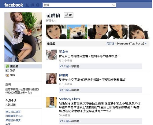 范群偵的粉絲專頁一上線已有近5000人按贊,相簿則搜集了范偵群超過300張的性感照片,不少網(wǎng)友聲援她,贊她很有勇氣,還說她若出寫真集必買。(中國臺灣網(wǎng) 馮江)