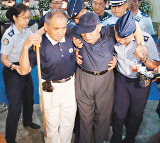 常建國(guó)85歲的老父(右二)離開(kāi)靈堂時(shí),難過(guò)到走不動(dòng)。圖片來(lái)自臺(tái)灣《聯(lián)合報(bào)》
