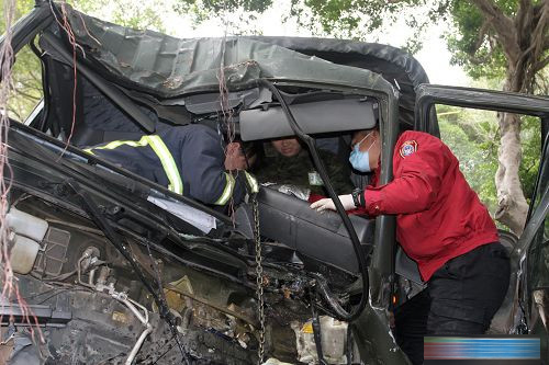 中國臺灣網(wǎng)2月17日消息 據(jù)臺灣媒體報道,金門縣今天上午7時50分許傳出一起軍車撞樹事故,1輛隸屬臺軍金門防御區(qū)的10噸重軍用大貨車行經(jīng)太武山聯(lián)勤支部門口,疑因閃避小狗撞上樹齡約50年的大榕樹,軍車車頭在猛烈撞擊下幾乎全毀,龔姓士兵(21歲,高雄人)駕駛該車輛,左腿骨折受困車內(nèi)約30分鐘。