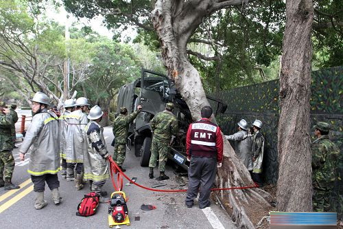 疑因閃狗險沖營區(qū) 軍車撞樹兵骨折。(圖片來自臺灣媒體)
